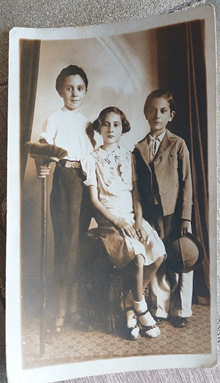 Породична фотографија младенаца из 1932. године, Лозница, Краљевина Југославија. На слици су Станојка и Живорад Васиљевић, прабаба и прадеда Михаила Монашевића.
