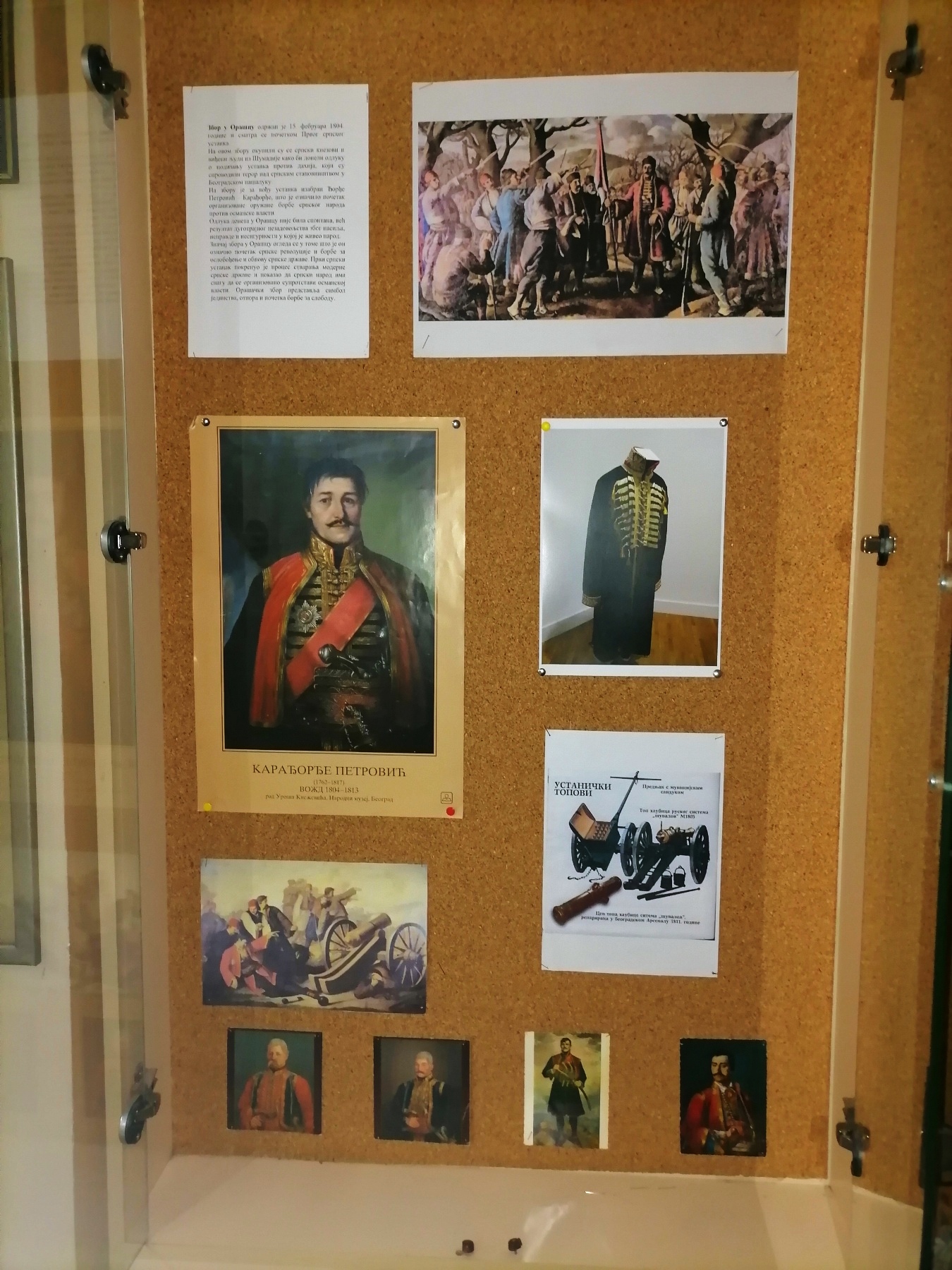 У првом делу изложбе приказан је историјски контекст устанка: портрети Карађорђа Петровића и истакнутих устаничких вођа, међу којима је и протојереј Матеја Ненадовић, сцене из борби, устанички топови и оружје, као и репродукције познатих уметничких дела која приказују збор у Орашцу и борбе против Турака.