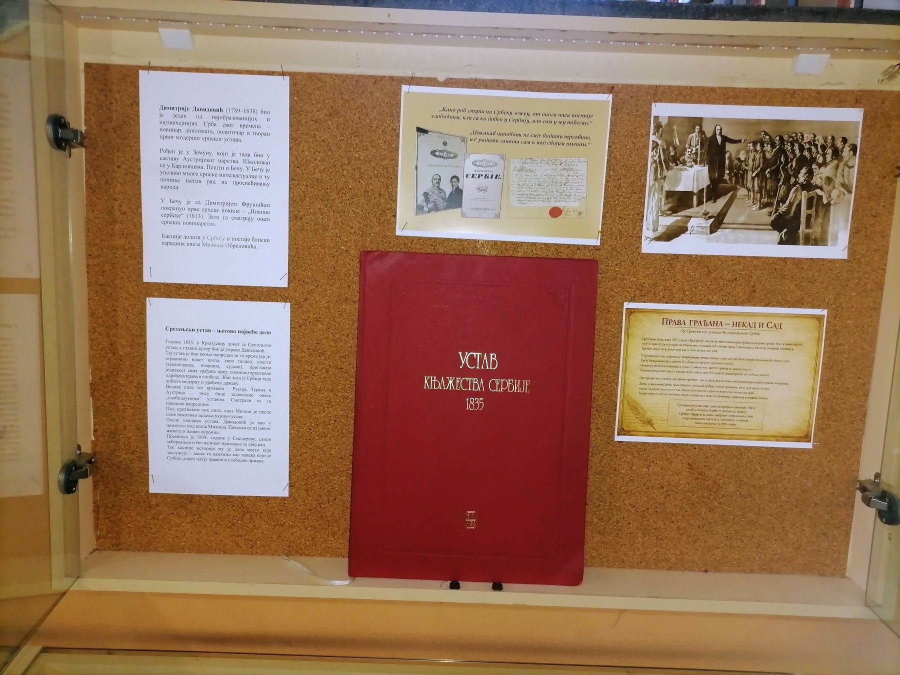 Други сегмент изложбе посвећен је Сретењском уставу и личности Димитрија Давидовића, творца овог значајног документа. Уз његов портрет и биографске податке, изложена је и репродукција насловне стране Устава Књажества Сербије из 1835. године, као и текстови који објашњавају његов значај.