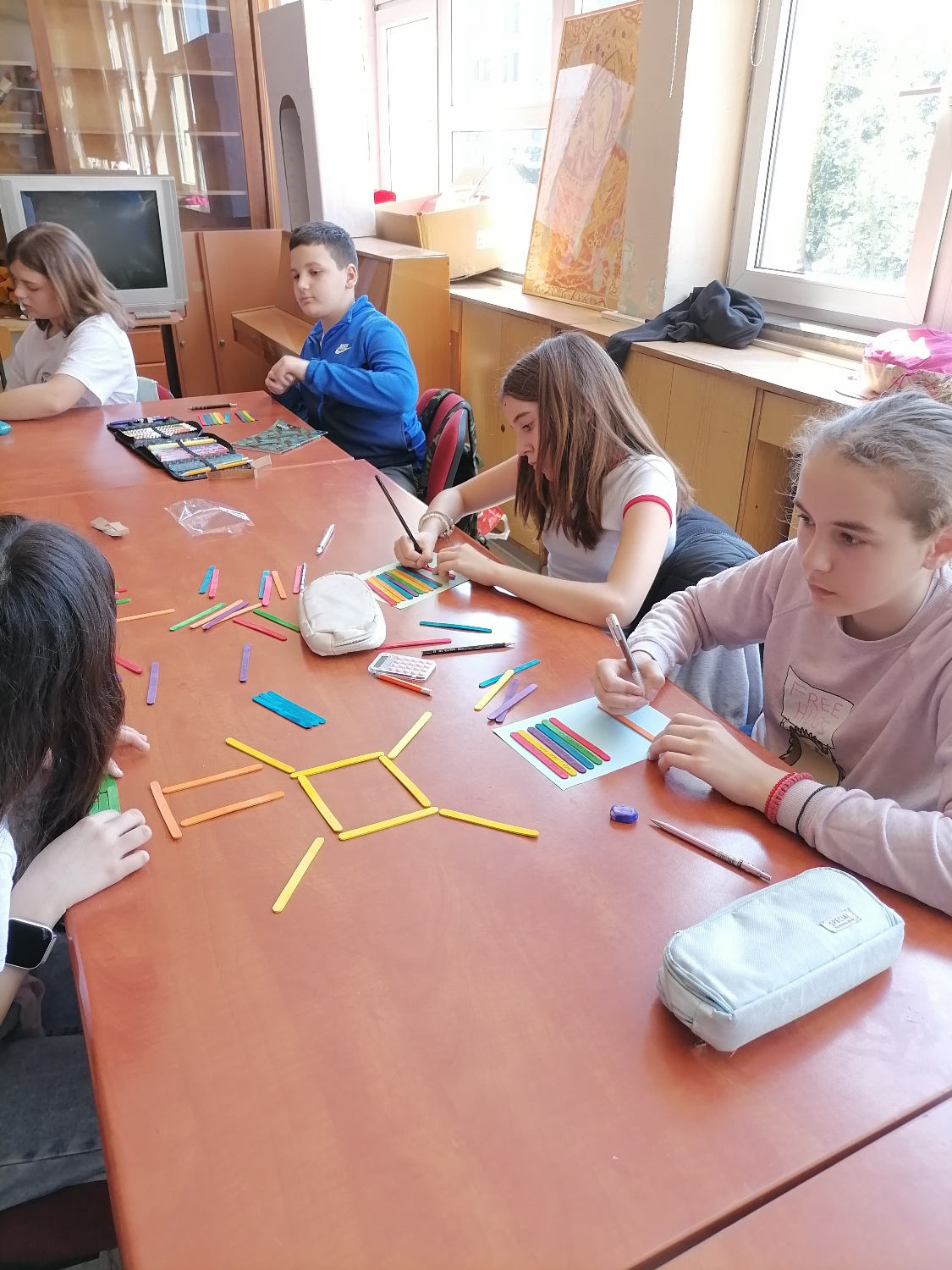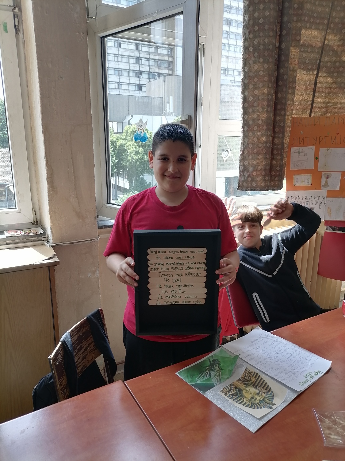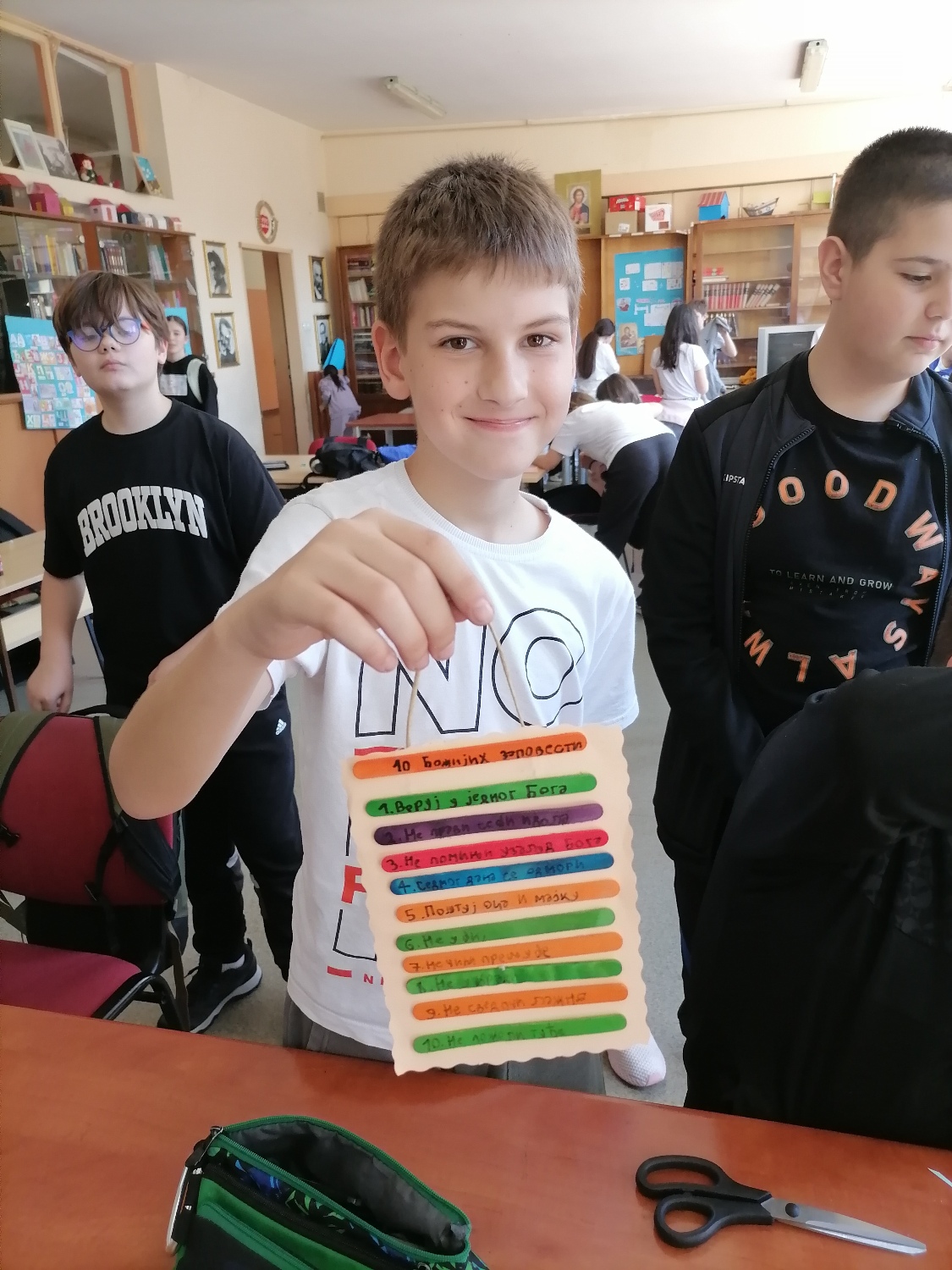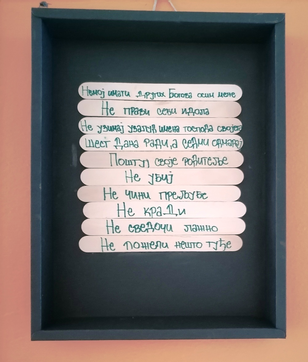 Ученици петог разреда наше школе су учили Десет Божјих заповести на веома креативан начин. На часу веронауке, направили су табелу од дрвених штапића на којима су исписали сваку од заповести. На тај начин, кроз игру и рад рукама, лакше су запамтили важне поруке и значење заповести.